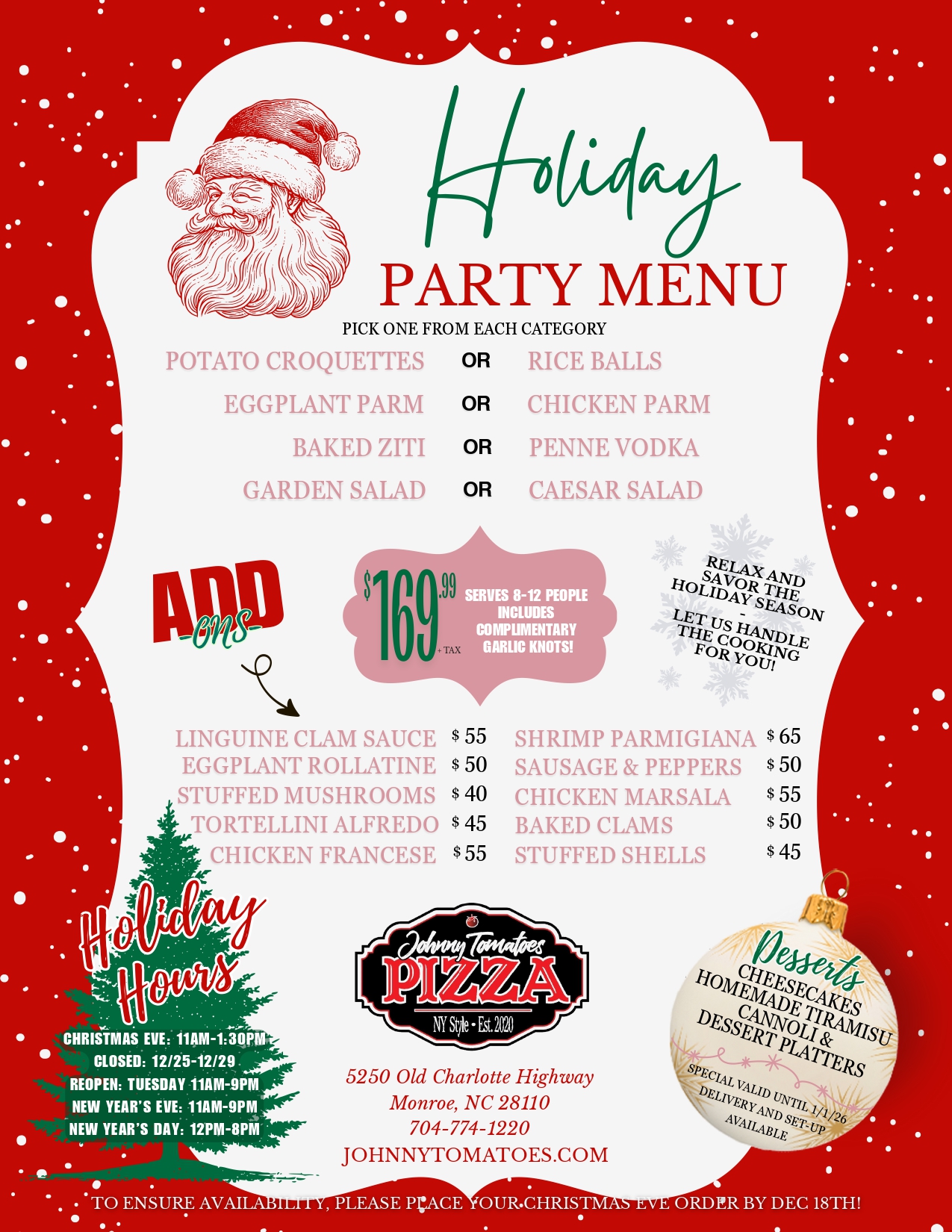 Upcoming EventsOrder Johnny Tomatoes pizza, pasta, and heroes online for pickup or delivery. Just a few clicks and your meal is on the way. Hot, cheesy, and ready when you are!
